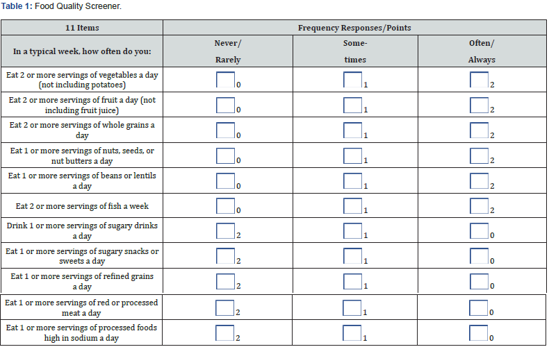 The Food Quality Screener (FQS) consists of 11 items mainly adapted from the Alternative Healthy Eating Index (AHEI) index categories; a validated dietary quality scoring system associated with lower risk of chronic disease and premature mortality (Table 1) [12]. Items 1-6 assess consumption of high-quality, nutrient-dense foods: vegetables (excluding potatoes), fruits (excluding juice), whole grains, nuts/seeds, legumes, and fish. These foods are emphasized in the AHEI and linked to reduced risk for cardiovascular disease, type 2 diabetes, and certain cancers due to their fiber, antioxidant, and healthy fat content [13,14].