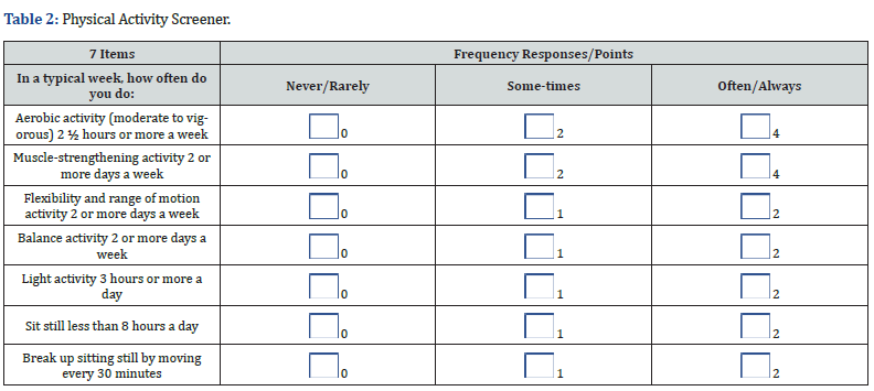 The Physical Activity Screener (PAS) includes seven items that assess the frequency, variety, and balance of movement behaviors aligned with national guidelines and evidence-based recommendations (Table 2). The first two items measure engagement in aerobic activity (e.g., brisk walking, jogging) for at least 2½ hours per week (Item 1) and muscle-strengthening activities (e.g., squats, lifting weights) at least twice weekly (Item 2). These recommendations reflect the Physical Activity Guidelines for Americans, which emphasize the health benefits of both aerobic and resistance exercise for cardiovascular, metabolic, and musculoskeletal health [25]. Items 3 and 4 focus on flexibility and balance training, respectively often overlooked yet vital components of functional fitness, fall prevention, and injury reduction, especially for older adults [26]. Item 5 assesses participation in light-intensity physical activity (e.g., housework, yardwork, standing tasks) for three or more hours per day, recognizing the cumulative health benefits of non-exercise movement throughout the day [27]. Items 6 and 7 address sedentary behavior, specifically sitting less than eight hours per day and breaking up sitting every 30 minutes with movement. These items reflect emerging evidence on the health risks of prolonged sedentary time, independent of moderate-to-vigorous physical activity [28]. By encompassing a range of intensities and movement domains, the screener provides a comprehensive, behaviorally specific profile of physical activity and inactivity.