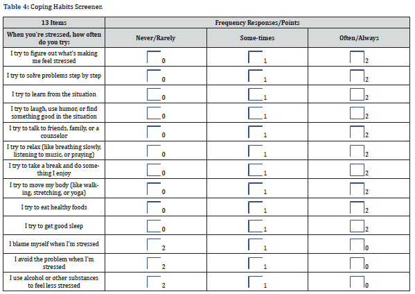 The Coping Habits Screener (CHS) includes 13 items that assess a range of strategies individuals use to manage stress in everyday life (Table 4). The first ten items reflect adaptive coping behaviors that are commonly associated with improved mental health and resilience. Items 1-3 assess cognitive coping, such as identifying stressors (“figure out what’s making me feel stressed”), problem-solving (“solve problems step by step”), and learning from difficult experiences all of which are central to cognitive-behavioral models of stress management [39,40]. Items 4–6 represent emotion-focused coping strategies, including using humor, seeking social support, and engaging in calming activities like prayer or music, which are linked to improved mood and emotional regulation [41,42]. Items 7-10 emphasize self-care behaviors taking breaks, moving the body, eating healthy foods, and getting adequate sleep that contribute to stress recovery and overall well-being [43,44]. In contrast, Items 11-13 reflect maladaptive coping patterns, such as self-blame, avoidance, and using substances to manage stress. These responses are reverse scored, as they are associated with negative outcomes including increased anxiety, depression, and substance misuse [45,46]. By including both adaptive and maladaptive strategies, the screener supports a balanced, behaviorally specific assessment of coping habits. It encourages reflection on which responses may be helpful, and which might signal a need for additional support or skill development.