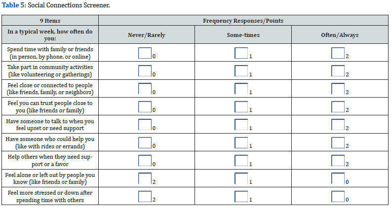 The Social Connections Screener (SCS) includes eight core items that assess the presence, quality, and effects of social relationships in everyday life (Table 5). The first two items evaluate social engagement the frequency of contact with friends or family (Item 1) and participation in community activities such as volunteering or gatherings (Item 2). These behaviors reflect involvement in both personal and community-level networks, which are associated with stronger support systems and improved well-being [47,48]. Items 3 and 4 assess the quality of close relationships, asking whether individuals feel emotionally connected to others (Item 3) and whether they can trust the people closest to them (Item 4). These aspects are key indicators of perceived social support, a known protective factor for mental and physical health [49]. Items 5 and 6 address functional support, measuring whether individuals have someone to confide in during distress (Item 5) and someone who can provide instrumental assistance, such as help with errands or transportation (Item 6). These types of support emotional and tangible have been shown to buffer the effects of stress and reduce risk for depression and chronic disease [50]. Item 7 captures reciprocity, assessing whether the respondent helps others when needed. Giving support can enhance feelings of purpose and belonging, reinforcing mutual social bonds [51]. Finally, Items 8 and 9 identify negative social experiences, including feelings of loneliness or exclusion (Item 8) and social interactions that increase distress (Item 9). These items are reverse scored to capture social strain, which has been independently linked to poorer health outcomes [52]. Together, the items provide a brief yet comprehensive overview of both protective and risk-related dimensions of social connectedness.