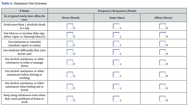 The Substance Use Screener (SUS) consists of eight items that assess patterns and contexts of alcohol, nicotine, cannabis, and medication use (Table 6). Items 1-4 focus on the frequency and type of substance use, including drinking more than one alcoholic drink per day (Item 1), using tobacco or nicotine (Item 2), using marijuana in any form (Item 3), and using prescription medications in ways other than prescribed (Item 4). These behaviors reflect commonly misused substances and align with established risk indicators for substance-related harm [55,56]. Item 1’s alcohol threshold also mirrors guidance from the National Institute on Alcohol Abuse and Alcoholism (NIAAA), which defines low-risk drinking limits based on daily and weekly intake [57]. Items 5-8 examine situational and functional use, including using substances to cope with stress (Item 5), before engaging in potentially dangerous activities like driving or working (Item 6), to manage negative emotions such as sadness or boredom (Item 7), or continuing use despite adverse consequences at home or work (Item 8). These questions capture behavioral patterns associated with problematic substance use and align with criteria found in validated screening tools such as the ASSIST and the AUDIT [58,59]. They also reflect core elements of the Transtheoretical Model, which emphasizes identifying risk behaviors and raising awareness as precursors to behavior change [21]. Collectively, the screener enables brief risk stratification across substance types and contexts, supporting early identification and referral using evidence-based models like SBIRT [60].