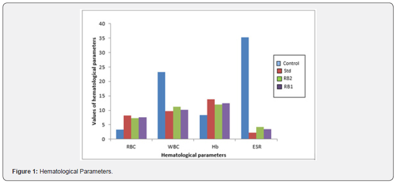 The administration of RB1, RB2 on Freund′s adjuvant induced arthritis animals enhanced the levels of RBC and Hb compared to control animals (Table 1 & Figure 1). The WBC count and ESR were significantly reduced after administration RB1 and RB2 compared to control animals. Rheumatoid Arthritis is a common autoimmune disorder, the immunologically mediated FCA induced arthritic model is considered as one of the outstanding animal model of RA. FCA induced arthritis is an animal model of chronic polyarthritis with features that look like RA. Inoculation of animals with FCA (which was prepared by suspending heatkilled Mycobacterium butyricum in liquid paraffin at a dose of 10 mg/ml Mycobacterium butyricum in paraffin oil), is known to produce a profound systemic inflammation.