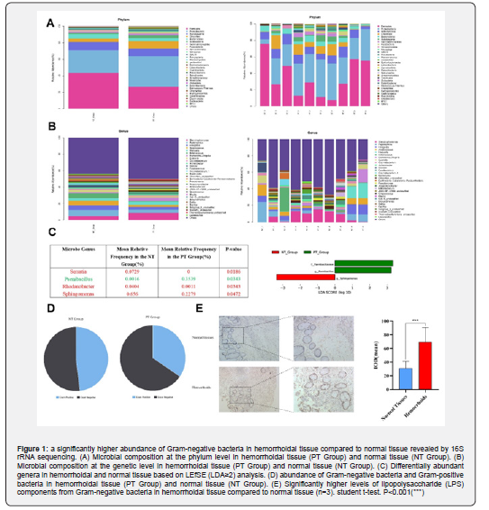 Currently, the widely recognized mechanism for the development of hemorrhoids is the displacement of the anal cushions, although the specific mechanism for this movement is not yet clear. After the occurrence of hemorrhoids, various pathological changes such as bacterial infection, inflammation, vascular alterations, and connective tissue changes can be observed. The location of hemorrhoids is adjacent to the intestine, and previous works have extensively focused on the study of intestinal microbiota in various health issues such as tumours [6], atherosclerosis [7], and aging [8]. Gram-negative bacterial walls are primarily composed of peptidoglycan, lipopolysaccharide (LPS), and lipoproteins. Compared to Gram-positive bacteria, the components of Gram-negative bacterial cell walls are more likely to induce inflammatory reactions, with LPS playing a significant role in these effects. It has been reported that, in individuals with type 2 diabetes, intestinal dysbiosis revealed an increase in Gram-negative bacteria, and elevated levels of LPS can lead to the generation and release of pro-inflammatory factors, accelerating the progression of the disease [9]. Study by Cani et al. [10] reported that prebiotics can promote gut microbiota balance in obese mice, reduce LPS production, and inhibit liver inflammation. However, there hasn’t been a systematic study on the microbial content and types in hemorrhoids. This study conducted sequencing on human hemorrhoid tissues and revealed new research findings in this regard.
