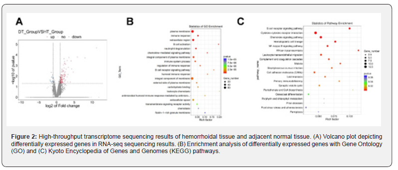Fifteen pairs of hemorrhoid tissue and corresponding adjacent tissue were collected for analysis. These samples were obtained from patients with Grade III or Grade IV hemorrhoids who received treatment at Jiangsu Cancer Hospital. This research was approved by Ethics Committee of Jiangsu Cancer Hospital with Ethical Review No. KY-2024-144. After haemorrhoidectomy, the collected specimens were preserved in liquid nitrogen. All specimens were obtained with the informed consent of the patients or their family members. RNA was then extracted by Trizol/chloroform method and an OD260/OD280 ratio was measured to determine the purity of the RNA (typically maintained between 1.8-2.0). Patient’s hemorrhoid tissues were used as the sample group, and the corresponding adjacent normal tissues were used as the control group. After total RNA extraction, ribosomal RNA (rRNA) was removed to enrich for mRNA. The isolated RNA was fragmented into smaller pieces and then used to create a sequencing library by attaching sequencing adapters to the RNA fragments. This library preparation step was followed by PCR amplification and subjected to high-throughput sequencing using the Illumina Novaseq™ 6000 sequencing platform.