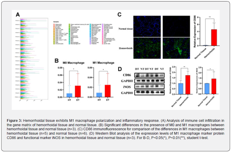 CIBERSORTx algorithm was used to analyse the differential gene expression matrix from the sequencing data. Results revealed that, compared to normal tissues, the infiltration of M0 and M1 macrophages in hemorrhoid tissues was significantly increased (Fig. 3A, B). This result was confirmed by CD86 immunofluorescence analysis of hemorrhoidal tissue sections in comparison with normal tissue (Fig.3C). In addition, Western Blot analysis of CD86 and the functional macrophages marker iNOS in hemorrhoid tissue showed that the expression levels of the M1 macrophage markers CD86 and iNOS were significantly higher in the hemorrhoidal tissues than in normal tissues (Fig.3D). It is evidenced that Gram-negative bacteria cell wall component LPS can induce macrophages polarization toward the M1 phenotype, leading to the production of pro-inflammatory responses and pro-inflammatory factors such as IL-6 and TNF-α. Thus, the enrichment of Gram-negative bacteria and the occurrence of inflammation in hemorrhoids may be closely linked through the polarization of M1 macrophages.