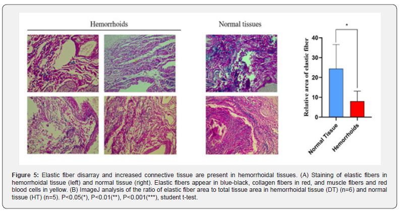 Collagen and elastic fibers are major components of connective tissue and play a crucial role in maintaining normal tissue function. As previously mentioned, high levels of activated MMPs are rapidly produced and released in inflammatory sites. MMP-9 degrades type IV collagen and gelatine and may play an important role in the degradation of elastic fibers and tissue remodeling and disarray [18]. A significant correlation between MMP-9 and the infiltration of polarized macrophages in hemorrhoidal tissues was observed in this study (Fig.3D). Victoria blue staining revealed that, compared to normal tissues, hemorrhoid tissues showed a decrease in collagen volume and a significant reduction in the relative content of elastic fibers (Fig. 5). This suggests that the deterioration of connective tissue in hemorrhoids is associated with marked fragmentation of collagen and elastic fibers, which is related to the inflammation triggered by M1 polarization, leading to the promotion of MMP-9 expression.