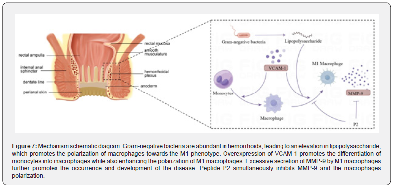 In conclusion, the MMP-9 inhibitor peptide P2 mitigates the development of hemorrhoids by inhibiting M1 macrophage polarization and the inflammatory response in hemorrhoid tissues, providing a potential new strategy for exploring novel treatment approaches.