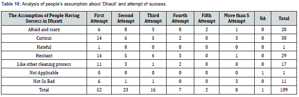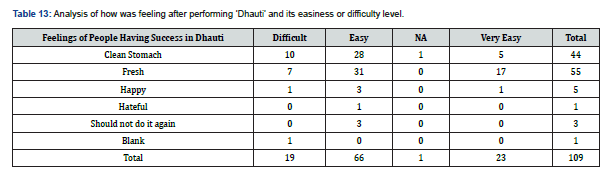 (Figure 4) There are 78 out of 109 are positive about Dhauti. This is 71% of the total number of people who have done Dhauti successfully. This shows people’s positive awareness of Dhauti. (Table 8) indicates that most of those who were afraid, scared, curious (27%), and hesitant about Dhauti in prior situations have recommended Dhauti directly. There, 30% were hesitant to do so. All of them have done Dhauti successfully. Of those people who were afraid and scared, almost 60% (12) of them recommended Dhauti afterward. Of those who were hesitant, 51% of them also recommended Dhauti. Of those who felt ‘Not So Bad’, 72% (8/11) recommended Dhauti. Very few people recommended ‘With Doctor’s advice’, meaning they consider this could be done with self-help. Only 1% of people were hateful, but did Dhauti successfully. Most people who were hesitant, curious, or scared (12+16=28) recommended Dhauti afterward.