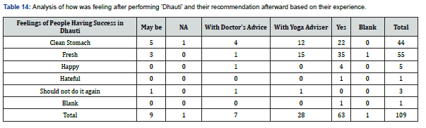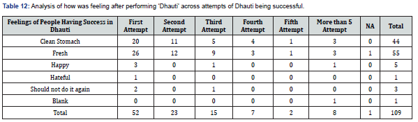 People who were ‘Afraid or Scared,’ ‘Hesitant,’ who thought it was ‘like another cleaning process’ have recommended performing Dhauti with a ‘Yoga Adviser.’ For the ‘Yoga adviser/ teacher’ might have played an important role. (Table 9) indicates that those hesitant before Dhauti felt clean stomachs afterward. Most people who were curious about Dhauti, 19/30, felt fresh afterward. Most people who felt afraid and scared felt fresh and clean stomachs afterward. (Table 10) specifies that most people, regardless of whether they were afraid, scared, hesitant, or felt okay, succeeded in the first or second attempt. People curious or felt Dhauti was ‘not so bad’ also went to more than five attempts. As given in (Table 11), out of the people who were feeling negative about Dhauti, 86% changed their minds, and then they recommended Dhauti, which is 40% of the total people who were successful about Dhauti. This is a very good conversion rate. This clearly indicates that people get convinced after Dhauti that it is a better cleaning technique.