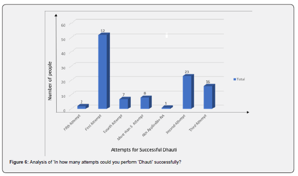 (Figure 5) Most of the people, 55(28+27) out of 109(51%), were feeling fresh. 44(18+26) out of 109(42%) were feeling a Clean Stomach. Very few/negligible people hate it or respond that they will not do it again. 104/109 (95%) people had positive feelings about Dhauti. 48 Females and 56 males out of 109 were positive about it. This means that the number of males and females with positive feelings is almost comparable overall. (Table 12) specifies that most First attempt people are feeling (A clean Stomach, Fresh, and happy to do it. Some people have gone beyond five attempts and made it successful; further, they felt fresh, and some felt a clean stomach. (Table 13) specifies that most people who felt Dhauti easy or very easy felt “Clean Stomach” or “Fresh” after Dhauti. (Table 14) indicates 81% of people out of successfully done ‘Dhauti’ have recommended Dhauti whose Feeling was ‘Clean Stomach’ or ‘Fresh’. (Figure 6) indicates that 51% people out of successful people have done Dhauti successfully on their first attempt in life, and 20% have done it the second time. In all, 71% of people have done Dhauti successfully in the first or second attempt. It means 20% of people who were not successful had hope that they may be successful a second time, and they have attempted. This may be because of the partial feeling they have about its benefits. Some people have attempted more than 5, which is a commendable commitment.