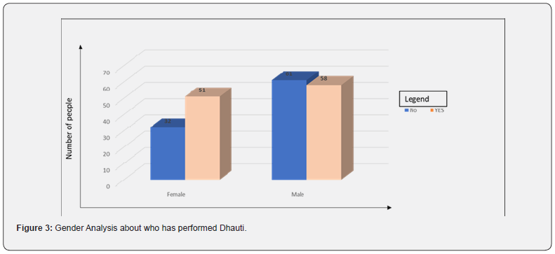 (Figure 2) shows the number of people who have given a response (YES/NO) to the question,” Have you performed Dhauti?”. There were 202 responses, out of which Dhauti was successfully performed by 109 people. That means around 54% have attempted Dhauti as well as they know Dhauti and were successful.