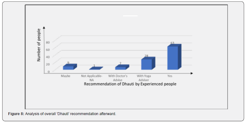 There are 90% people out of the total successful people have recommended Dhauti. What was the recommendation for people who have never done Dhauti? Almost 10% of people recommended doing it with a Yoga Adviser. However, nobody has recommended a Physician. This indicates that people are more oriented toward yoga advisers nowadays. (Figure 8) indicates that 70% of people accepted that they would recommend ‘Dhauti’ to others directly. So, these subjects are confident about the effect of ‘Dhauti’. 47% of people give advice that they want to advise ‘Dhauti’ with the help of a Yoga Adviser. There 14% of people have not confirmed whether they will recommend ‘Dhauti’. Only 7% of people said they would recommend it with the help of a Physician or Doctor. This means that people think a Yoga adviser is enough to teach ‘Dhauti’ or a Yoga adviser can be a better option. Of those who have not done Dhauti but have some idea about it, 20% of them advised to perform ‘Dhauti’ with a Yoga adviser’s help. It is surprising to know that 5% of people advise ‘Dhauti’ though they have not done it, considering the effectiveness of cleaning.