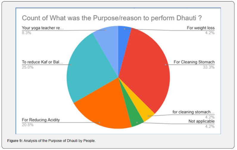 When enquired people having Dhauti done successfully, they responded with the purpose of it. (Figure 9) indicates that most people have the purpose of “Cleaning the Stomach.” Below that, people also did Dhauti to reduce Kaph dosh and balance tri dosh. In this question, only 24 out of 109 respondents responded afterward (figure 9).