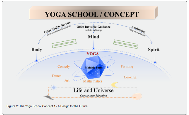 Facing oneself directly can be painful, which is why mind yoga itself is challenging to “sell” as it requires confronting oneself without any filter process. Spiritual yoga can be guided through physical practice: when body and mind unite, the spirit enters a wonderful state-an experience we, as living beings, as creatures, can enjoy in this lifetime. Thus, a future yoga school (as imagined by the lead author) is built upon this understanding. It is hoped to offer visible services that serve the beauty and health of the body, which also acts as a step toward facing and conversing with the self since direct self-inquiry (what may be called traditional or original yoga) can be painful and difficult to accept. It will also strive to provide invisible guidance as a tool toward understanding suffering. Finally, the aim is to an awakening spiritual experience which is a profound human joy that one can savor as vibrant, conscious beings (Figure 2).