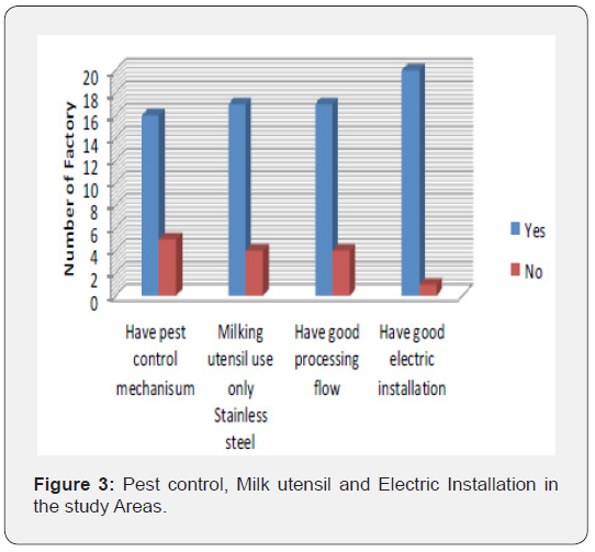 According to the current study 90.5% of milk processing plants in the study area have enough light in processing room that able to generate confidence during processing milk and milk products. The current study revealed the result of [11] the 21% of the factories lighting were adequate to carry out operations and protected whereas about 9.5% of milk processing plants in current study has not enough light in processing room, which was difficult to produce or process safe milk and milk products.