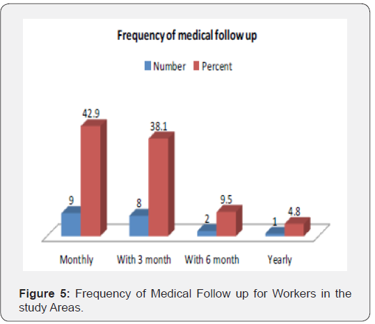 According to the current study 95.24% of the plants worker in the study area was follow medical checkup regularly with different frequency and only 4.76% were not follow regularly. About 42.86%, 38.1%, 9.5% and 4.76% check their workers’ health with monthly interval, with three months, with six month and yearly interval; respectively. But must be check for those disease which able to transmit from milk to human. Employees experiencing diarrhea, vomiting, open - skin sores, boils, fever or disease must report these symptoms to their supervisor and must not be allowed to work with edible food products.