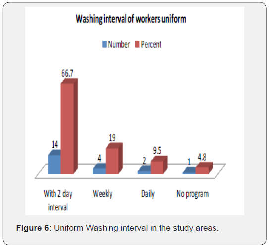 According to the current study 95.2% of milk processing plants worker give attention for personal hygiene. About 66.7% of the milk processing plants workers washes their uniform within two-day intervals, 19% with week interval, 9.5% wash daily and 4.8% of milk processing plants workers have no program but wash as it is necessary.