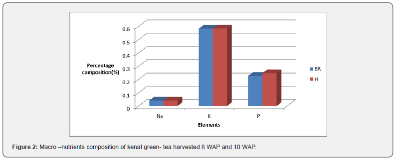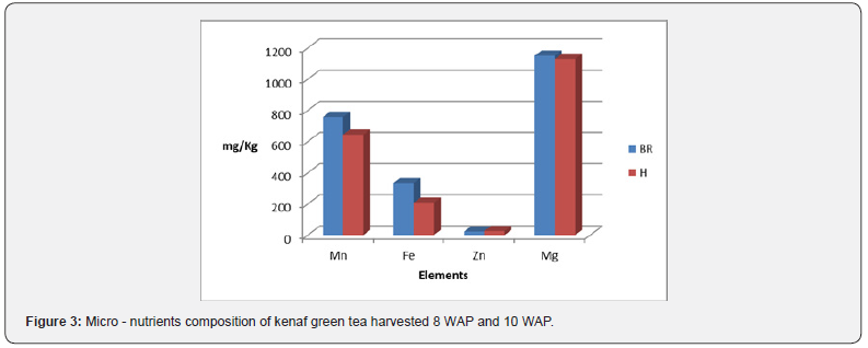 The result of mineral analysis showed that kenaf green tea sample (BR) harvested at10 WAP was significantly higher in micro-nutrients and magnesium than the kenaf green tea (H) sample harvested at 8 WAP, although there was no significant difference in some macro-nutrients like potassium and sodium (K and Na) between the two samples as shown in (Figures 2 & 3).