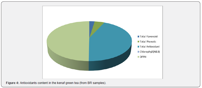 The result of the antioxidant analysis showed that kenaf green tea from BR contained significant amounts of total antioxidants as well as exhibiting high capacity to scavenge 1, 1- diphenyl-2- picrylhydrazyl (DPPH) free radical (Figure 4). Kenaf green tea contained flavonoids- and total phenolic-compounds. These are important bioactive compounds that combat oxidative stress in the body. In addition, kenaf green tea contained the least amount of chlorophyll A & B.