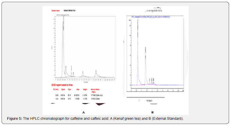 The results of this study were at par with the report of [6]. which stated that chemical composition of green tea was complex including minerals and trace elements like calcium, magnesium, chromium, manganese, iron, copper, zinc, molybdenum, selenium, sodium, phosphorus and pigments like chlorophyll. Owing to the great importance of these minerals in green tea, many studies have recommended that their levels in tea leave to be 5% dry weight and 4.5% infusion [5,9]. The chromatogram showed that caffeine and caffeic acid in kenaf green tea formed conspicuous peaks at the same time as the external standard. The findings of this research strongly correlated with the report of [5]. which revealed that fresh leaves contained 3-4% of alkaloids known as methylxanthine such as caffeine, theobromine, and theophylline at 0.4 -10% [10]. Kenaf green tea contained Caffeine, which is known as 1, 3, 7-trimethylpurine-2,6-dione with a chemical formula C8H10NO2. Caffeine stimulates the central nervous system and the body. Caffeine is not inherently a dangerous substance unlike other stimulants. Caffeine helps to speed up the signals being sent to the brain thereby causing better productivity, and alertness/ awareness. However, like other stimulants, overconsumption of caffeine can have negative effects on the body and these effects include jitters, seizures, nausea, insomnia, dysphoria (or fast heart rate). According to the Food and Drug Administration (FDA), 400mg/day of caffeine is considered to be safe and healthy daily amount for healthy adults [11,12].