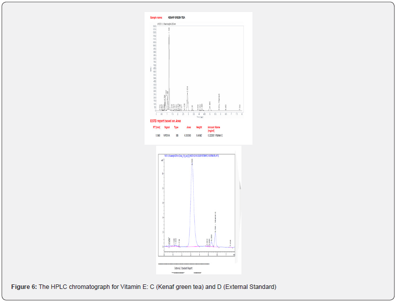 HPLC analysis revealed that kenaf green tea contained vitamin E (Tocopherol) as shown in (Figure 6). The Tocopherol was detected with a peak at 235nm wavelength and RT of 5.435min.