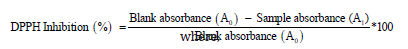 The antioxidant potential of the sample was evaluated using 2, 2-diphenyl-1-picrylhydrazyl (DPPH) radical scavenging assay, as described by Shahid et al. [18]. To perform this technique, 1 ml of the DPPH (0.004%) in methanol solution was added to 3 ml sample. Later, the prepared solution was kept in dark for thirty minutes. The absorbance was recorded at λ 517nm. A low absorbance of reaction combination suggests strong radical scavenging activity. The solution empty of plant extract served as the control group [19]. The test was repeated three times to avoid any human error. To determine DPPH percentage inhibition in radical samples, the following formula was followed