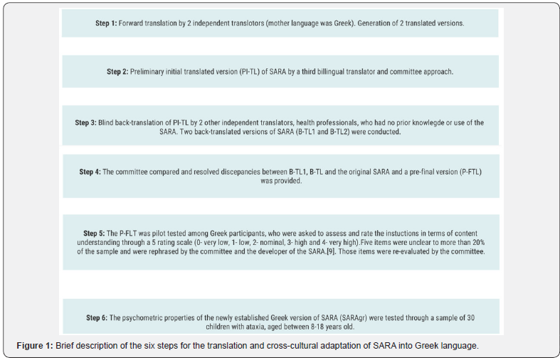 This research study describes the conduction of a 2 year cross-sectional trial for adapting the SARA in Greek language for pediatric population with ataxia. Translation and cross-cultural adaptation of SARA into Greek followed international guidelines [14], as described in Figure 1 and was processed and completed within a period of approximately 4 months. Assessment of the psychometric properties of the newly adapted into Greek scale, was conducted on site or online, due to the great distance of some participants’ location of residence from Athens, Greece, which lasted from October 2020 since July 2022.