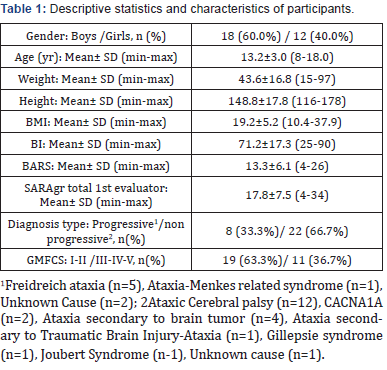 Demographic and clinical characteristics of participants are presented in Table 1. In summary, twenty two participants were children with non-progressive type of ataxia, while most of them have been assigned in the spectrum of ataxic cerebral palsy (verified dysfunction of the cerebellum). The rest were diagnosed with genetic related dysfunctions and only one child was still under investigation of the ataxia related symptomatology. Eight participants were children with progressive type of ataxia, five of them diagnosed with Freidreich ataxia, one with a Menkesrelated syndrome and two more children with undefined cause of progressive ataxia. According to GMFCS the majority of the participants were independent in indoor settings with difficulties in outdoor activities (Level I n=2; Level II n=17). The rest children had more gross motor functional limitations with six of them needing hand-held mobility device or some assistance by a person while walking (Level III). Three children required physical assistance or powered mobility in most settings (Level V) and only one child required manual wheelchair in all settings (Level IV).