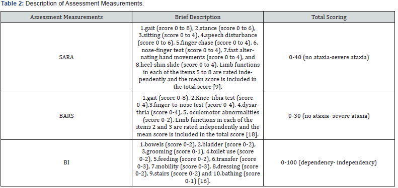 - Perez‐Lloret S, Warrenburg B, Rossi M, Rodríguez-Blázquez C, Zesiewicz T, et al. (2021) Assessment of Ataxia Rating Scales and Cerebellar Functional Tests: Critique and RecMov Disord 36(2): 283-297.
