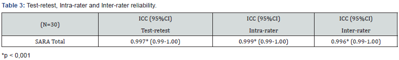 Methods: The performance of 30 children with progressive and non-progressive cerebellar ataxia and Gross Motor Function Classification System (GMFCS) I-V (18 boys/ 12 girls; 13.2 ± 3 years old) on SARAgr was rated twice by two pediatric physiotherapists for inter-rater, intra-rater and test-retest reliability. For convergent validity SARAgr was correlated with the Brief Ataxia Rating Scale (BARS) and the Barthel Index (BI).