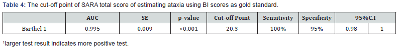 The variability of SARAgr’ score was further assessed by examining interpretability through floor or ceiling effects, which are considered to be present if more than 15% of respondents achieved the lowest or highest possible score, respectively. The clinical importance of SARAgr was assessed through the cut-off point of SARA total score. A receiver operating curve (ROC) analysis, [28] was conducted to obtain the cut-off level of SARAgr total score for differentiation between subgroups of patients formed on the basis of their ability of activities of daily living, calculating the respective areas under the curve (AUC). The areas under the ROC curve (AUC) with standard error and 95%CI were calculated, using the maximum likelihood estimation method. The sensitivity and specificity of different cut-off points of SARAgr total score were estimated using the BΙ score (21< severe < 60 vs 61< moderate<90) as gold standard methods of ability of activities of daily living.