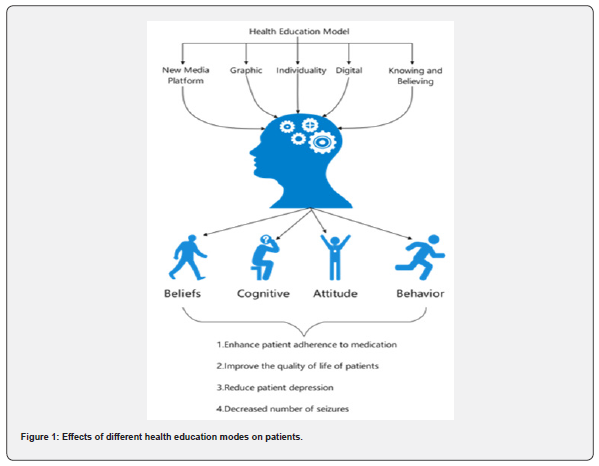 Fan Fangfang [8] showed that face-to-face, internet, and messenger-based education methods not only improved medication adherence and quality of life in patients with epilepsy but also significantly reduced the number of seizures in patients. Muller-Godeffroy et al. [9]. conducted a comparative observational study of children and adolescents with epilepsy and their parents in an organized program of epilepsy knowledge education, The results showed an increased awareness and selfmanagement of epilepsy in affected children and adolescents, and a reduction in parental anxiety and family burden. Comprehensive and systematic health education can enhance patients’ knowledge of the disease, improve compliance behavior, reduce the number of seizures, improve their psychological status and improve their quality of life. Various health education models are listed and described below (Figure 1).