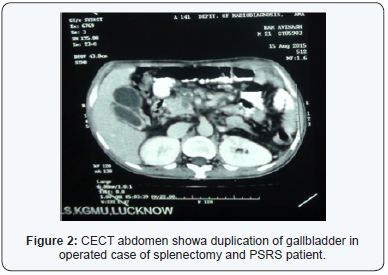 A 22-year-old non-alcoholic young male was admitted in Surgical Gastroenterology ward for Extrahepatic Portal Venous Obstruction with massive splenomegaly. During evaluation he was found to have duplicated gallbladder, detected by abdominal ultrasonography as well in Magnetic Resonance Cholangiopancreatography (MRCP). The patient was asymptomatic and had no significant past medical history including hospitalization. On physical examination, his abdomen was distended with massive splenomegaly, and the gallbladder was not palpable. Laboratory data were unremarkable. After comprehensive evaluation patient underwent proximal splenorenal shunt (PSRS) with splenectomy for his recurrent upper gastrointestinal bleeding and pancytopenia which were persistent after endoscopic management (recurrent bleeding from esophageal varices despite endoscopic variceal band ligation). Diagnosis of DG was made during postoperative period on follow-up Doppler ultrasound abdomen for patency of shunt. On retrospective evaluation, his MRCP shows duplication of gallbladder with separate necks and cystic ducts. Patient was asymptomatic for his duplication of gallbladder. His liver function test was normal.