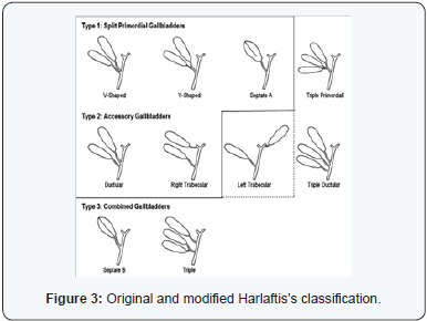 In 31 BC, the first case in human being was reported in a sacrificial victim of Emperor Augustus [1] Duplication of the gallbladder is a uncommon developmental anomaly of the extrahepatic biliary system with reported the incidence of 1 in 4000. In occurs as exuberant budding developing biliary tree during 5-6 weeks of embryogenesis. Harlaftis et al. [2] report, 207 duplicated and 8 triple gallbladders [2]. Two type of classification this congenital abnormality are described by Boyden’s and Harlaftis’s respectively [2,3]. But classification of surgical relevance is the Harlaftis classification (Figure 3). Basis of classification is the duplication of gallbladder in relation to cystic duct. Type one is duplication gallbladder with a single cystic duct also known as ‘split primordium group’ or ‘vesica fellea divisa’ .Type Two is duplication gallbladders with separate cystic duct draining into common bile duct, also known as ‘accessory group’ or ‘vesica fellea duplex’. Our case was type 2 duplication gallbladder.