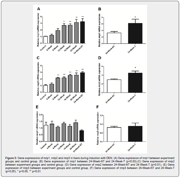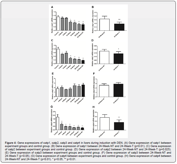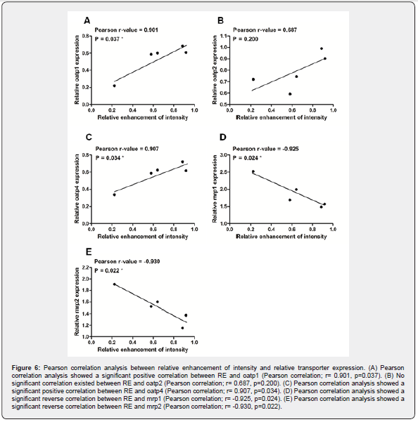 Results: The expressions of oatp1, oatp2 and oatp4 gradually decreased, while 24-Week-T group was significantly lower than 24-Week-NT group (p=0.01, p=0.025, p<0.01). Mrp1 and mrp2 gradually increased, while the 24-Week-T group were significantly higher than 24-Week-NT group (p=0.03, p=0.01). The signal intensity gradually decreased during hepatocarinogenesis (p<0.0001). The RE of 24-Week-T group was even lower than 24-Week-NT group significantly (p=0.006). Analysis showed the RE of intensity was correlated with the expression of oatp1, oatp4, mrp1 and mrp2 (p<0.05, respectively). There was no difference between untreated groups and control group in transporter expressions and RE.