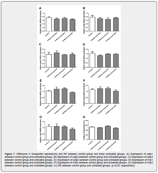 Because of the long-term study, age should be considered as one of the influence factors. Three untreated groups (8-Week- Untreated, 16-Week-Untreated, 24-Week-Untreated) at different time points were compared with control group to investigate the influence of age on parameters. The data suggested there was no difference between untreated groups and control group in transporter expressions and signal intensity of Gd-EOB-DTPA (Figure 7, p<0.05, respectively). These results indicated that age did not affect these parameters significantly.