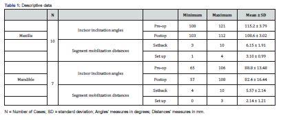 Ø On average, a maxillary segment setback of 6 mm and an upward movement of 3 mm improved the axial angle of the upper incisors by approximately 7 degrees. A mandibular segment setback of 5 mm and an upward movement of 2 mm changed the inclination of the lower incisors by 6 degrees (Table 1).