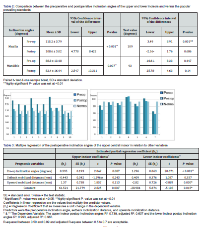 Ø Statistical analysis: The SPSS program (Statistical Package for the Social Sciences, Chicago, IL, USA) was utilized to calculate descriptive data including mean, minimum, and maximum. A paired t-test was employed to compare the preoperative and the geometrically drawn postoperative upper incisors' inclination, as well as the pre and postoperative lower incisors' inclination. Also, a one sample t-test was performed to compare the results against the normal standards, with an upper incisor-Frankfurt horizontal plane angle of 109 degrees and a lower incisor-mandibular plane angle of 93 degrees considered ideal. Multiple regression models were preformed to introduce the ideal equation model assessing the postoperative incisor inclinations. A good fit R-squared ranges between 0.50 and 0.99 and an adjusted R-square value from 0.5 to 0.7 were considered acceptable, especially when relations were significant. P- value of less than 0.05 was deemed statistically significant for all tests.