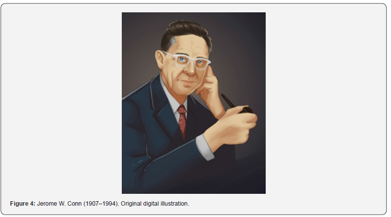 The spectrum of cortical hyperfunction was completed in 1955 with the description of primary hyperaldosteronism by Jerome W. Conn [20]. Based on the study of a 34-year-old patient with hypertension, tetany, and severe episodic muscle weakness, he proposed that an excess of mineralocorticoids was the underlying cause. Successful surgical resection of the adrenal adenoma confirmed his hypothesis, achieving complete remission of the hypertension and hypokalemia. This finding was groundbreaking, as it identified for the first time an etiology of arterial hypertension potentially curable by surgery, differentiating it from essential hypertension and broadening the therapeutic scope of adrenalectomy [21] (Figure 4).