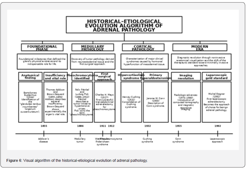 The algorithm structures the historical evolution into four fundamental branches that classify milestones according to their etiological and technological nature. The first branch, the foundational phase, groups the discoveries that rescued the organ from anatomical invisibility and defined its vitality (Eustachius, Addison, Brown - Séquard). The second, spinal cord pathology, addresses the identification of neuroectodermal tumors and their first surgical approach (Fränkel, Pick, Mayo). The third, cortical pathology, details the clinical characterization of the major syndromes of steroid hypersecretion (Cushing and Conn). Finally, the modern era branch integrates the non-invasive diagnostic revolution (CT and MRI) with the therapeutic transformation toward the laparoscopic gold standard (Gagner). At the bottom, a timeline chronologically orders the sequential appearance of the most important described pathological entities, from Addison’s disease to laparoscopic resolution (Figure 6).