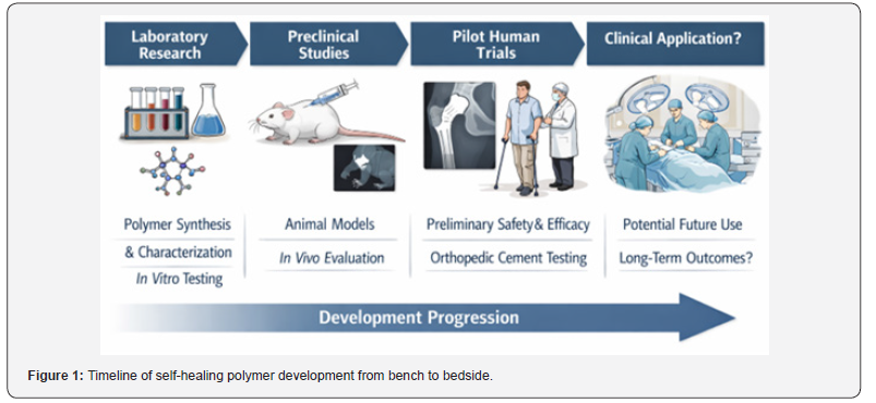 About 10-15 out of every surgical operation involves implant failure, and revision surgery costs healthcare systems more than 20 billion US Dollars every year [1]. The three major types of failure modes, namely mechanical fatigue, wear-induced damage, and biological encapsulation, have one thing in common: they are progressive and can often be undetected until clinical signs appear [2]. Conventional biomaterials, be it metallic, ceramic, or polymeric, are machined to act as mechanical components, yet they do not have adaptive designs to damage occurring [3]. Self-healing polymers constitute a radical break to this paradigm of no action. These systems are defined as those materials that can self-heal damage without any outside help and have the potential to restore mechanical integrity, inhibit crack growth, and improve useful life [4]. The difference between self-healing and biodegradable materials is vital to surgeons: the same is that both are related to the material transformation; whereas, in biodegradation, the structural integrity is deliberately removed, self-healing is focused on its maintenance [5].