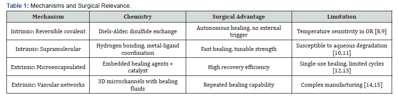 The self-healing polymers proceed through two major mechanisms: intrinsic mechanisms that involve reversible chemical attachments in the polymer framework, and extrinsic mechanisms that involve the incorporation of distinct healing agents [7]. These mechanisms can be summarized in terms of surgical relevance as in Table 1. Reversible covalent kinetic bonds, especially the Diels-Alder reaction of maleimide and furan groups, have shown thermal reversibility, which can be used in the orthopedic practice [16,17]. These systems are capable of being subjected to several healing cycles; however, they need higher temperatures (usually 80-120°C), which might be impractical to achieve in vivo activation [18]. New developments in roomtemperature Diels-Alder elastomers have the potential to be translated into clinical practice [19]. Hydrogen bond, π-π stacking, and metal-ligand coordination are supramolecular interactions that provide quick healing at physiological temperatures [20]. The Ureidopyridinone (UPy) quadruple hydrogen bonding has demonstrated specific efficacy in soft tissue applications with a healing efficacy of greater than 90% in minutes [21]. However, such non-covalent interactions can be weakened under wet biophysical conditions [22].