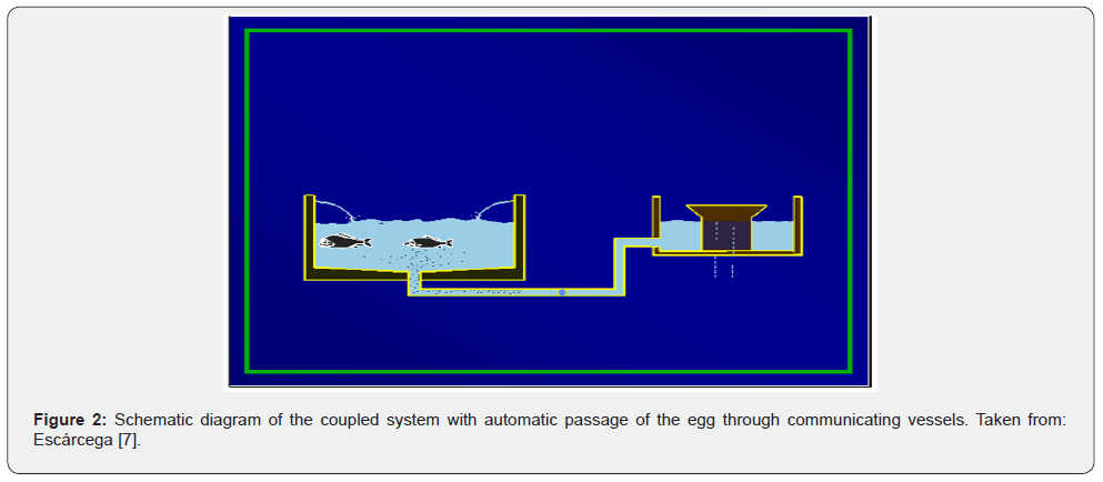Under the operating principle described above, for largescale egg production, such as that expected with these species, multi-channel incubators can be coupled to a spawning pit, in which water flow and egg delivery are controlled by registers with control valves. This could be highly practical for spawning events with marine fish, which typically occur over two to four consecutive nights (in natural spawning and when hormonal implants are used to induce spawning). In this way, the egg can be channeled in batches to a specific incubation channel to achieve homogeneous batches of larval hatches, greatly optimizing the process (Figure 3) [8].