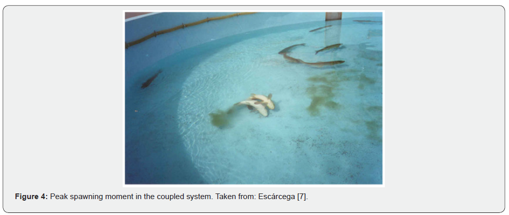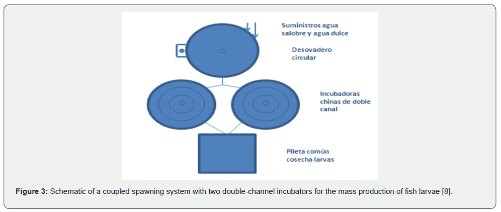 The average efficiency of this system achieved in the CA El Peaje was 69% hatching, in the spawning of the grass carp (Ctenopharingodon idellus), with levels reaching up to 78%, based on the number of eggs released. The average yield, in terms of viable fry/kg of weight In females, it was 62,000 units, with maximum values reaching up to 72,000 fry/kg [1]. Based on these indicators (particularly hatching), with the fertility and biological potential of the females of many species of diadromous marine fish such as those we are concerned with, it is easy to infer the enormous quantities of fry that could be achieved with this system. Details about its operation and results achieved in its application can be found in: Escárcega-Rodríguez [1] and FAO [5].