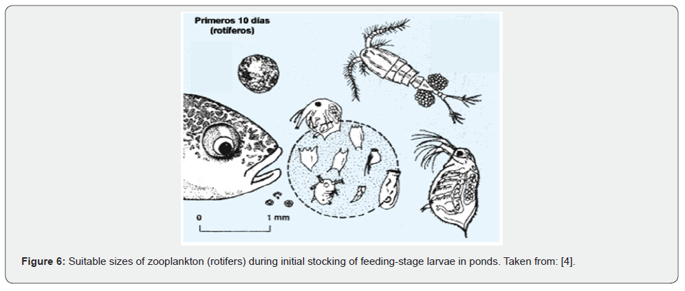 Photosynthesis contributes to the production of plant organic matter in ponds. Phytoplankton serves as the basis for zooplankton development. Thus, fry feed voraciously on zooplankton, selecting individuals whose size fits within their mouths, which are initially rotifers and copepod nauplii (Figure 6). Similarly, some predators feed on fish larvae, and losses can be high if proper management is not applied.