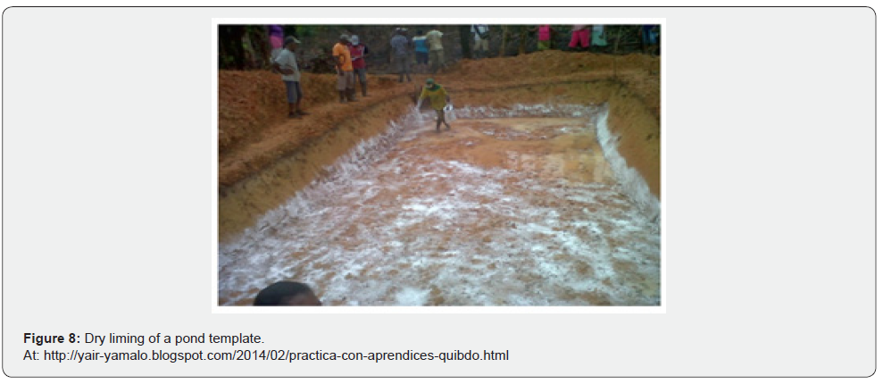 b) Quicklime (dry) is applied homogeneously to the bottom of the pond at a rate of 150 kg/ha (or 1 ton/ha of hydrated lime) to sterilize it and improve the soil structure (Figure 8).
