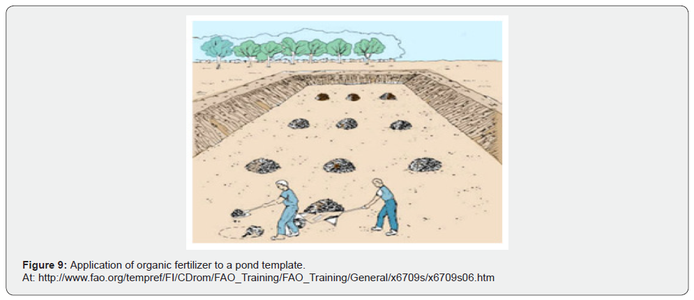 c) organic fertilizer (cattle or pig manure, for example) is spread evenly over the pond template at a rate of 3-5 ton/ha to ensure good development of natural organisms for feeding the fry (Figure 9).