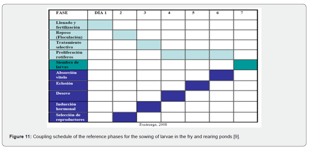 Likewise, with regard to the larval stage, based on the results achieved in other countries, such as with the Indo-Pacific snook (Lates calcarifer), it would be advisable to test alternative protocols for larval culture and rearing in mesocosms , in rustic ponds, in which the sowing of larvae in the feeding stage (approximately 48 hours after hatching) is coupled with the succession of zooplankton, which occurs naturally in ponds specially prepared for this purpose. In these protocols applied in Australia with L. calcarifer, survival rates ranging from 20 to 40% are reported, under stocking densities of 900,000 larvae/ha, with an additional advantage: a faster growth in larvae is presented with respect to that achieved in intensive systems of high control in small containers [2,3].