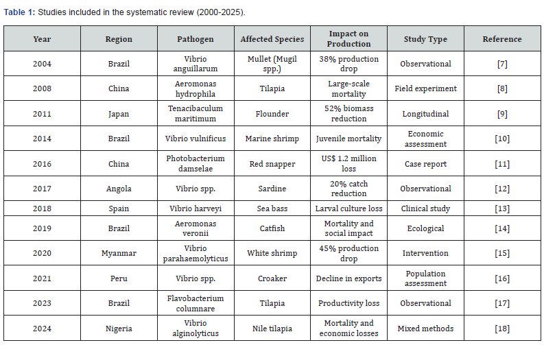 Results: The included studies span regions in South America, Asia, and Africa, with most reporting Vibrio-related outbreaks. Impacts on production ranged from 20% to over 50% biomass loss, with economic consequences such as reduced exports, market devaluation, and food insecurity. Most affected species were tilapia, shrimp, croaker, and sea bass. A significant knowledge gap was identified regarding control strategies and preventive measures.