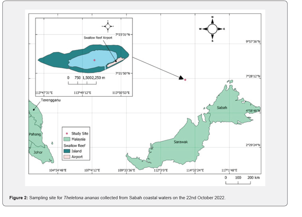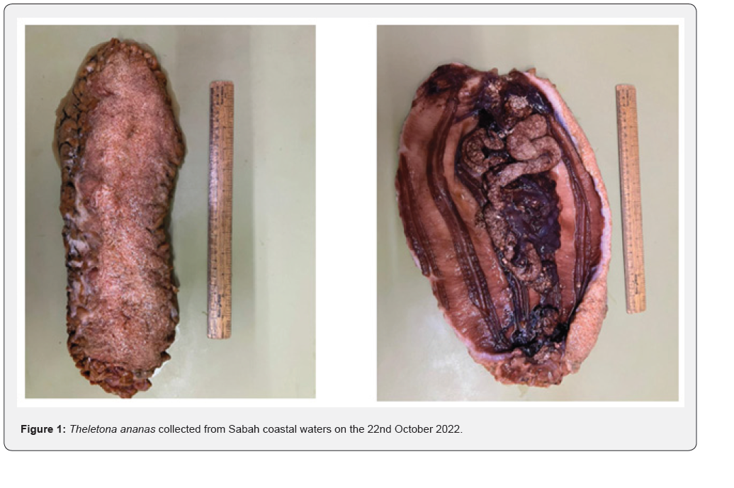 The sample of T. ananas (Family: Stichopodidae) (Figure 1) was collected from Sabah coastal water on 22nd October 2022 (Figure 2). The sea cucumber was 63cm in length and 550-1400g freshwater weight.